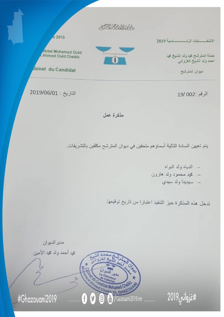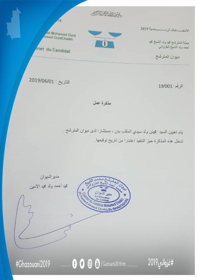 عين مدير ديوان المرشح محمد ولد الغزواني محمد أحمد ولد محمد الأمين الخبير الإداري، والمختص في العمليات الانتخابية، وفي النصوص القانونية المرتبطة بالانتخابات محمدن ولد سيدي “بدن” مستشارا في الديوان.