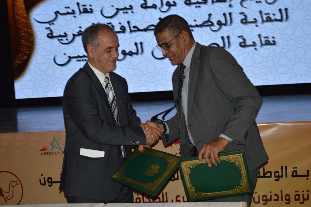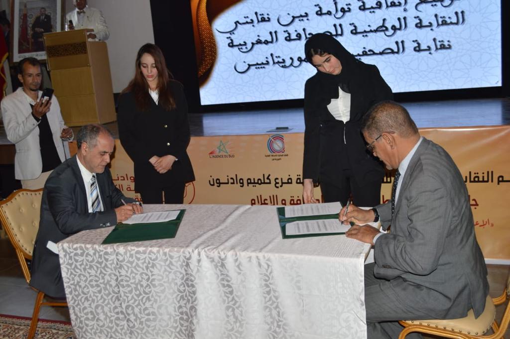 وقع السيد أحمد طالب ولد المعلوم ، نقيب الصحفيين الموريتانيين ، مساء السبت بكلميم بالمملكة المغربية اتفاقية شراكة مع رئيس النقابة الوطنية للصحافة المغربية السيد عبد الله البقالي .