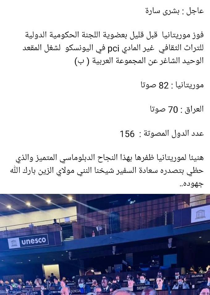 أعلن في باريس، عن فوز موريتانيا بعضوية اللجنة الحكومية الدولية للتراث الثقافي غير المادي pci التابعة لمنظمة الأمم المتحدة للتربية والعلوم والثقافة (اليونسكو