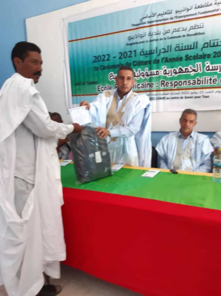 بدعم من بلدية نواذيبو، نظمت مفتشية نواذيبو للتعليم الأساسي، صباح اليوم 23/07/2022، حفلا بهيجا في مركز المعرفة للجميع، بمناسبة اختتام السنة الدراسية :2021- 2022 تحت شعار : المدرسة الجمهورية: مسؤولية الجميع.