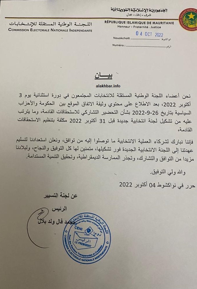 أعلن اليوم الاربعاء ، رئيس اللجنة الوطنية المستقلة للانتخابات محمد فال ولد بلال استقالته من منصبه و استقالة جميع اعضاء اللجنة، واوضح ولد بلال استعداد جميع اعضاء هيئته التعاون من جديد مع اللجنة الجديدة التي اتفقت الحكومة والأحزاب السياسية على تشكيلها قبل نهاية أكتوبر الجاري.