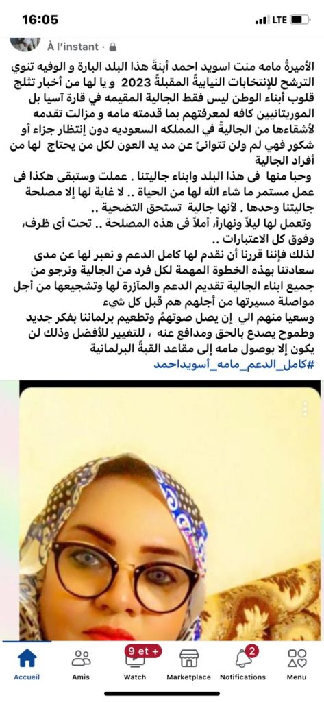 أعلنت الناشطة البارزة في الجالية الموريتانية بالمملكة العربية السعودية عن نيتها خوض الإنتخابات النيابية المقبلة خلال العام 2023 .