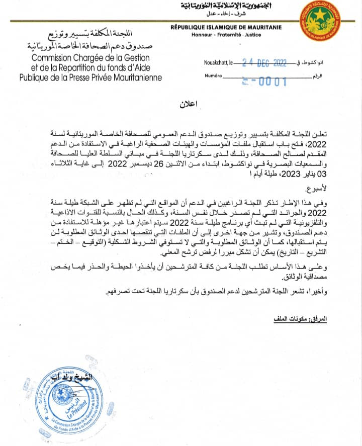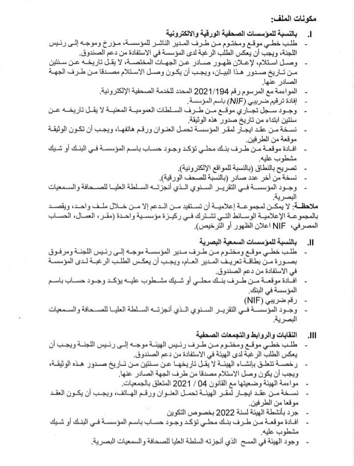 أعلنت اللجنة المكلفة بتسيير صندوق دعم الصحافة الخاصة لعام 2022 فتح باب استقبال ملفات المؤسسات الإعلامية الراغبة في الحصول على الدعم، وذلك ابتداء من الاثنين المقبل وإلى غاية 3 من يناير 2023.