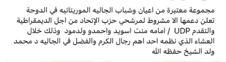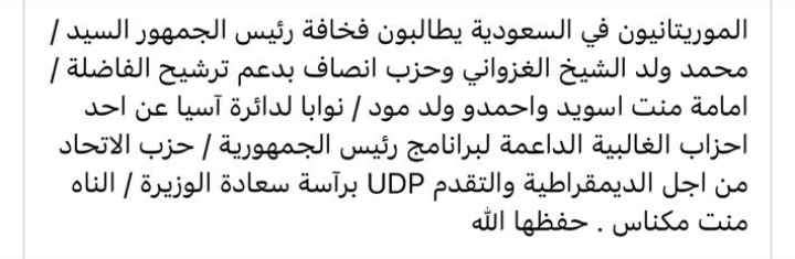 تظهر اللقاءات و التجمات الحاشدة التي تنظمها الجاليات الموريتانية في القارة الٱسيوية بشكل عام ، و في المملكة العربية السعودية و الإمارات العربية المتحدة على وجه أخص مطالب ملحة بدعم المرشحان للنيابيات القادمة : أمامة بنت سويد أحمد و محمد لمين ولد مود و هما مرشحان عن حزب الإتحاد من أجل الديمقراطي و التقدم في موريتانيا بقيادة الوزيرة المخضرمة الناها بنت حمدي ولد مكناس .