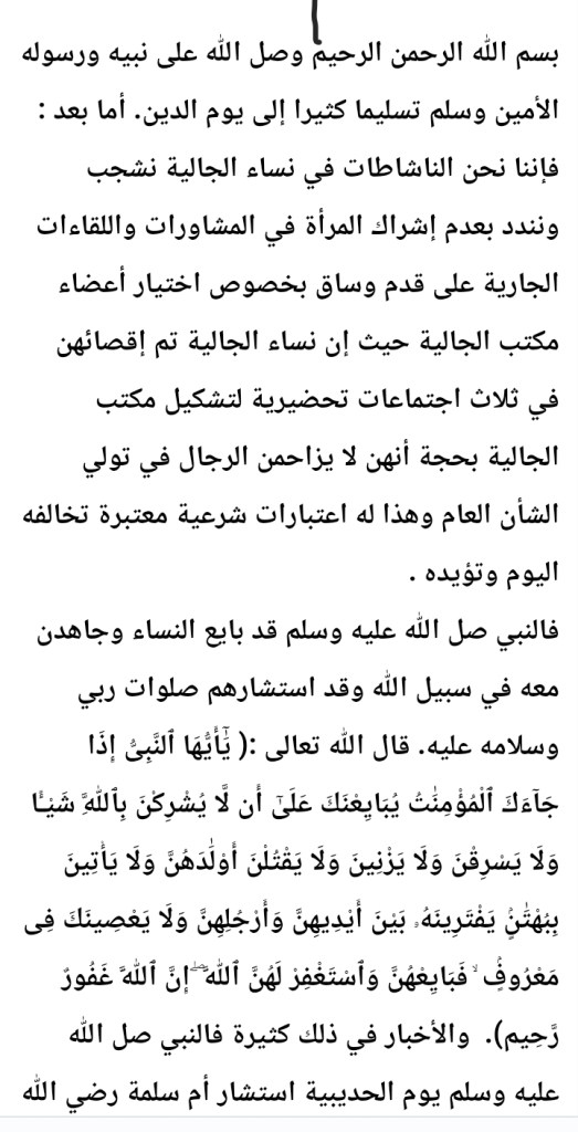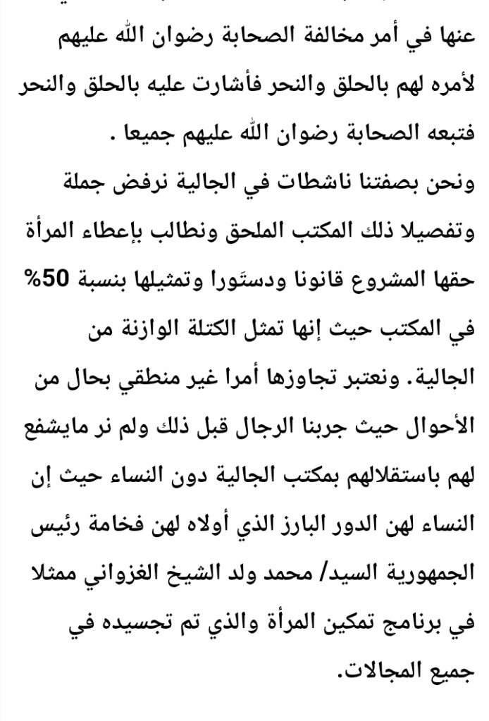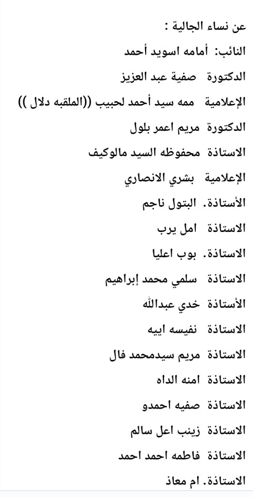 و تأسيسا على ما تقدم،فإن النساء في الجالية الموريتانية المقيمة في المملكة العربية السعودية يطالبن اليوم بإشراكهن في التشاور الجاري هناك من أجل إختيار ممثلين في مكتب الجالية. و بالمناسبة فإنهن يرفصن رفضا باتا كل محاولات التهميس و الإقصاء التي يقوم بها البعض من أجل حرمانهن من حقهن في المشاركة الفاعلة في كل ما يتعلق بشؤون الجالية التي هي امتداد طبيعي لشؤون الوطن الموريتاني.