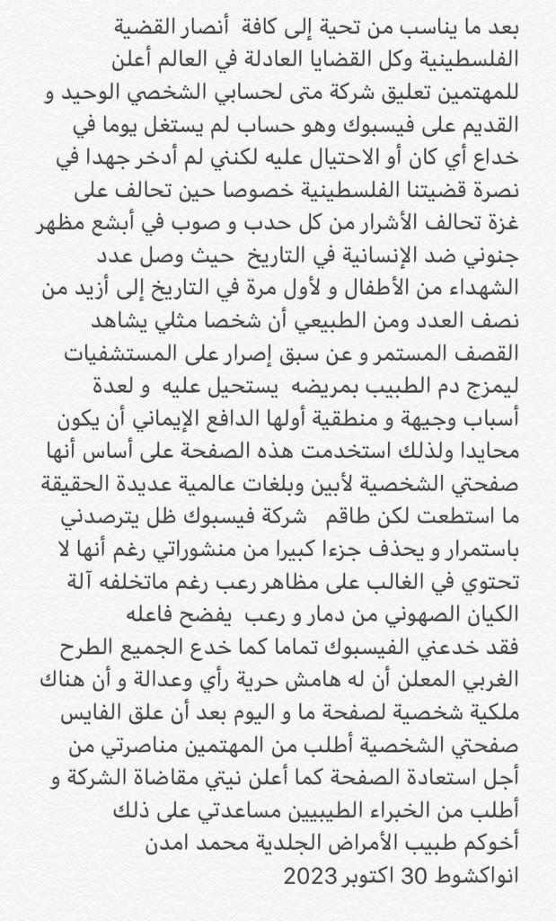 بعد ما يناسب من تحية إلى كافة أنصار القضية الفلسطينية وكل القضايا العادلة في العالم أعلن للمهتمين تعليق شركة متى لحسابي الشخصي الوحيد و القديم على فيسبوك وهو حساب لم يستغل يوما في خداع أي كان أو الاحتيال عليه لكنني لم أدخر جهدا في نصرة قضيتنا الفلسطينية خصوصا حين تحالف على غزة تحالف الأشرار من كل حدب و صوب في أبشع مظهر جنوني ضد الإنسانية في التاريخ حيث وصل عدد الشهداء من الأطفال و لأول مرة في التاريخ إلى أزيد من نصف العدد ومن الطبيعي أن شخصا مثلي يشاهد القصف المستمر و عن سبق إصرار على المستشفيات ليمزج دم الطبيب بمريضه يستحيل عليه و لعدة أسباب وجيهة و منطقية أولها الدافع الإيماني أن يكون محايدا ولذلك استخدمت هذه الصفحة على أساس أنها صفحتي الشخصية لأبين وبلغات عالمية عديدة الحقيقة ما استطعت لكن طاقم شركة فيسبوك ظل يترصدني باستمرار و يحذف جزءا كبيرا من منشوراتي رغم أنها لا تحتوي في الغالب على مظاهر رعب رغم ماتخلفه آلة الكيان الصهوني من دمار و رعب يفضح فاعله