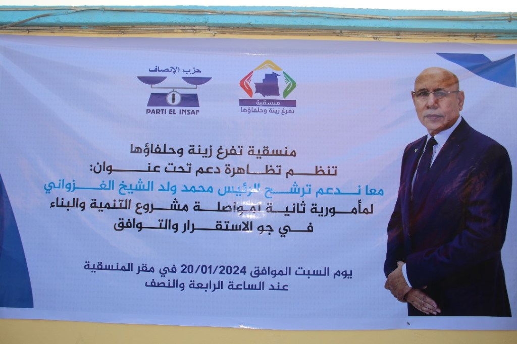 نظمت رئيسة جهة نواكشوط رئيسة منسقية تفرغ زينة وحلفاؤها السيدة فاطمة عبد المالك، مساء اليوم السبت 20 يناير 2024 بمقر المنسقية، تظاهرة سياسية حاشدة لدعم ترشح فخامة رئيس الجمهورية السيد محمد ولد الشيخ الغزواني لمأمورية ثانية.