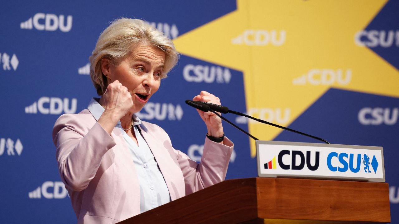 رئيسة المفوضية الأوروبية أثناء إلقائها خطابًا خلال التجمع الأخير للانتخابات الأوروبية لحزب المحافظين الألماني (CDU) في ميونيخ، جنوب ألمانيا، في 7 يونيو 2024 (أ ف ب)