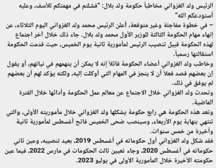 فقد شكل ولد الغزواني أول حكوماته أغسطس 2019، بعيد تنصيبه، وعين ثاني حكوماته أغسطس 2020، وجاء تعيين ثالث الحكومات مارس 2022، فيما عين حكومته الأخيرة خلال المأمورية الأولى يوليو 2023