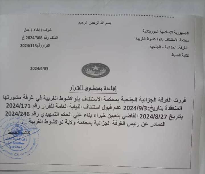 بتاريخ 2024/8/27 القاضي بتعيين خبراء بناء علي الحكم التمهيدي رقم 2024/246 الصادر عن رئيس الغرفة الجزائية بمحكمة ولاية نواكشوط الغربية.