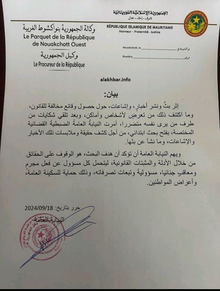 أخبار البلد/بتعليمات من النيابة العامة بنواكشوط الغربية اعلن عن فتح “بحث وتحقيق  ابتدائي” من أجل كشف حقيقة وملابسات الأخبار والإشاعات التي تم بثها ونشرها مؤخرا حول حصول وقائع مخالفة للقانون.