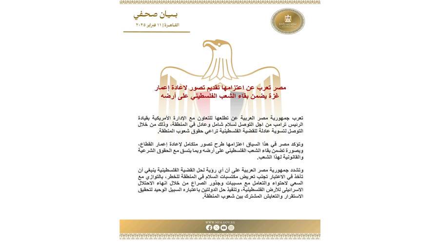 وأكدت مصر في هذا السياق اعتزامها طرح تصور متكامل لإعادة إعمار القطاع، وبصورة تضمن بقاء الشعب الفلسطيني على أرضه وبما يتسق مع الحقوق الشرعية والقانونية لهذا الشعب.