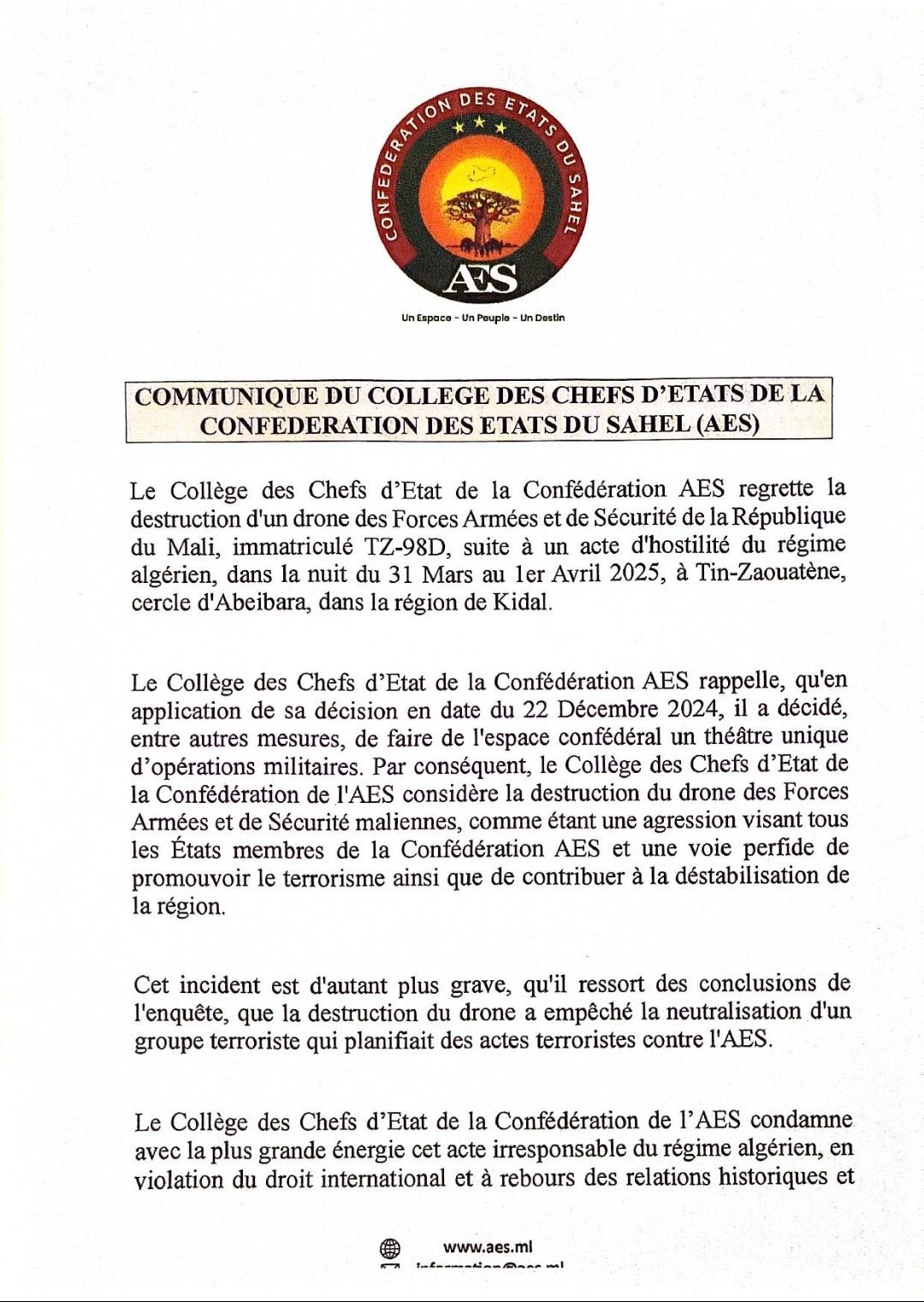 في المقابل، أوضحت وزارة الخارجية المالية في بيان أنها توصلت، بعد تحقيق أجرته، إلى أن الطائرة دُمرت بفعل “عمل عدائي متعمد من النظام الجزائري”. ولم تُصدر السلطات الجزائرية أي تعليق فوري على الاتهامات.