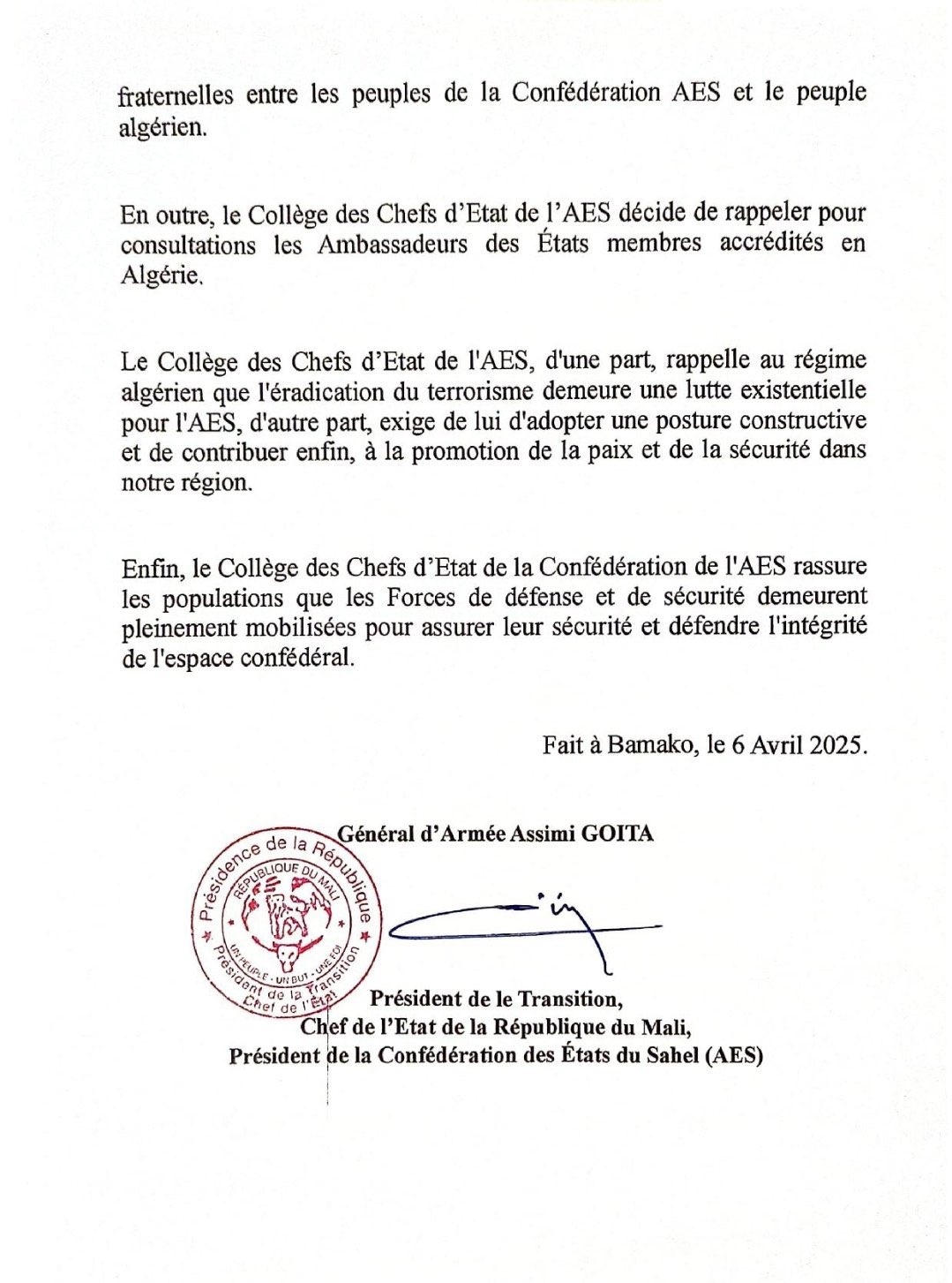 وجاء في بيان مشترك صدر عن الدول الثلاث أن “هيئة رؤساء تجمع دول الساحل تقرر استدعاء سفراء الدول الأعضاء، المعتمدين في الجزائر، للتشاور”.