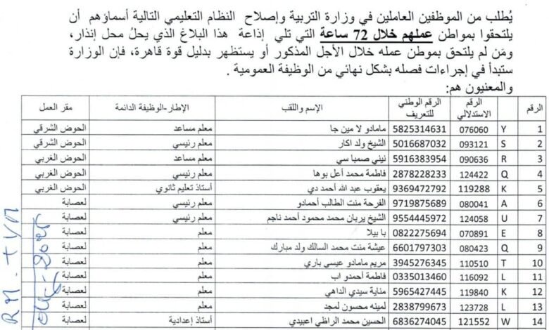 وجهت وزارة التهذيب الوطني وإصلاح النظام التعليمي في موريتانيا، إنذارات بالفصل النهائي من الوظيفة لـ61 من موظفيها، بسبب تغيبهم عن أماكن العمل دون مبررات.