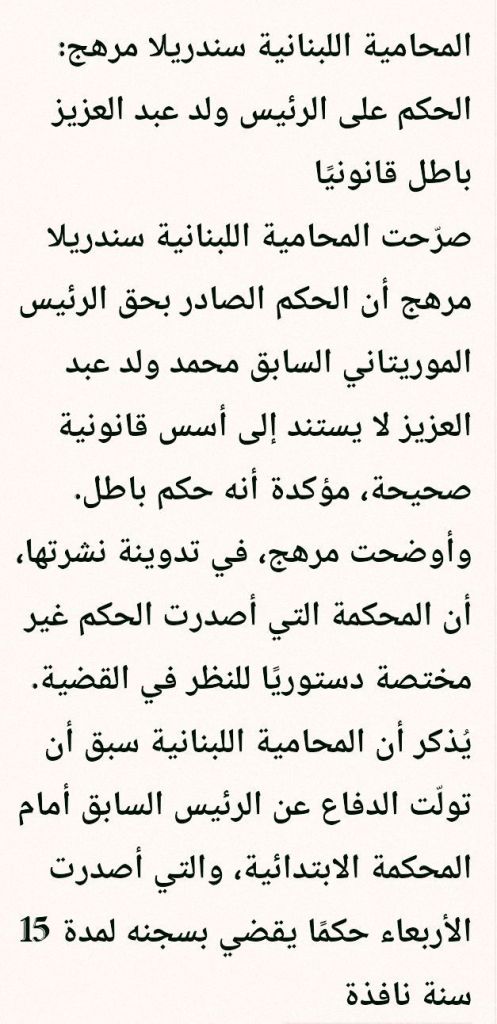 سندرلا مرهج:الحكم الصادر بحق الرئيس السابق محمد ولد عبد العزيز لا يستند إلى أسس قانونية صحيحة
