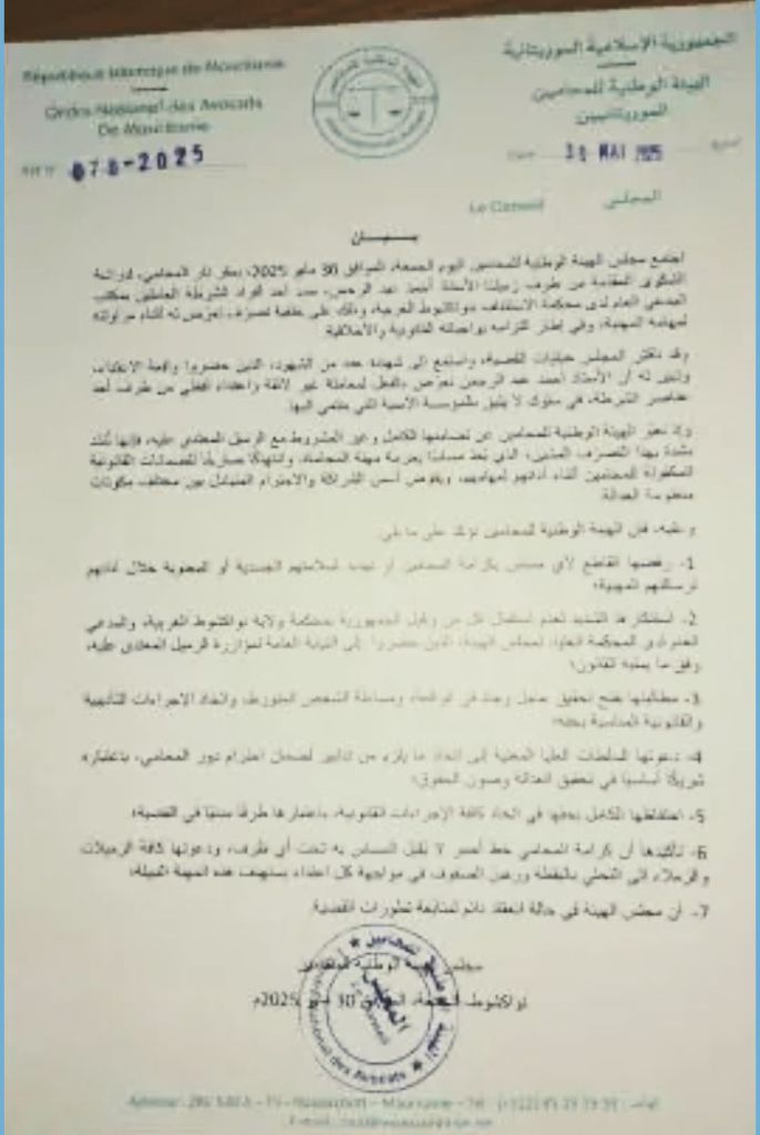 أعربت الهيئة الوطنية للمحامين الموريتانيين عن إدانتها الشديدة لما وصفته بـ”الاعتداء غير المبرر” الذي تعرض له المحامي أحمد عبد الرحمن على يد أحد عناصر الشرطة، في حادثة أثارت موجة من الاستياء داخل الأوساط القانونية.