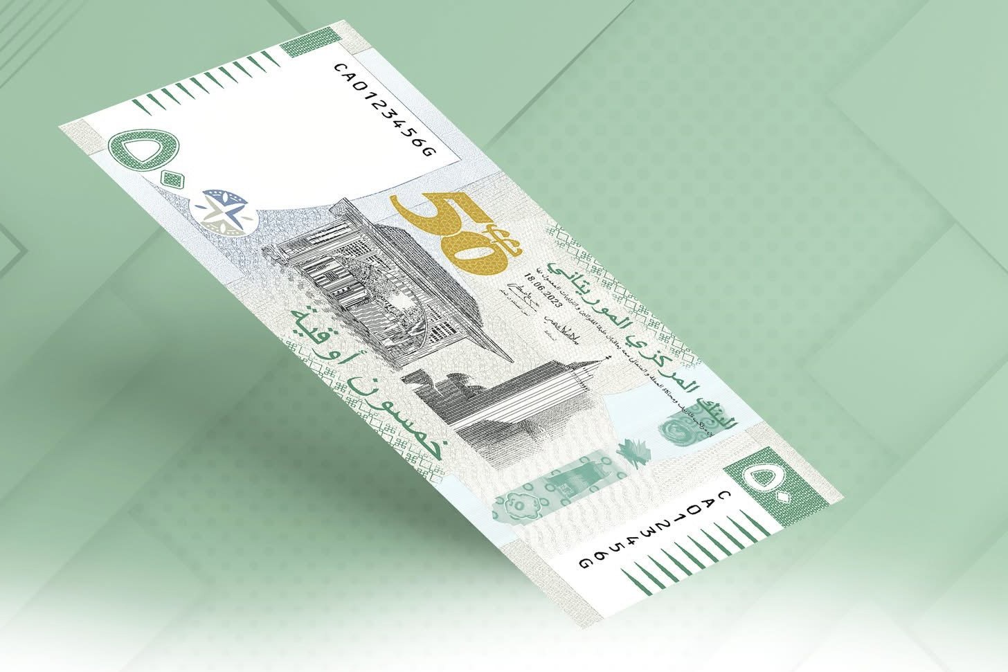 كما تحمل الورقة رموزًا وطنية وثقافية بارزة، من بينها دوائر “عين الصحراء”، وصفحات متقلبة ترمز إلى المصحف الشريف، وإشراقة مسجد شنقيط التاريخي، بالإضافة إلى الرقم “50” الذي يظهر في مشهد مائي ديناميكي، يرمز إلى الذكرى الخمسين.
