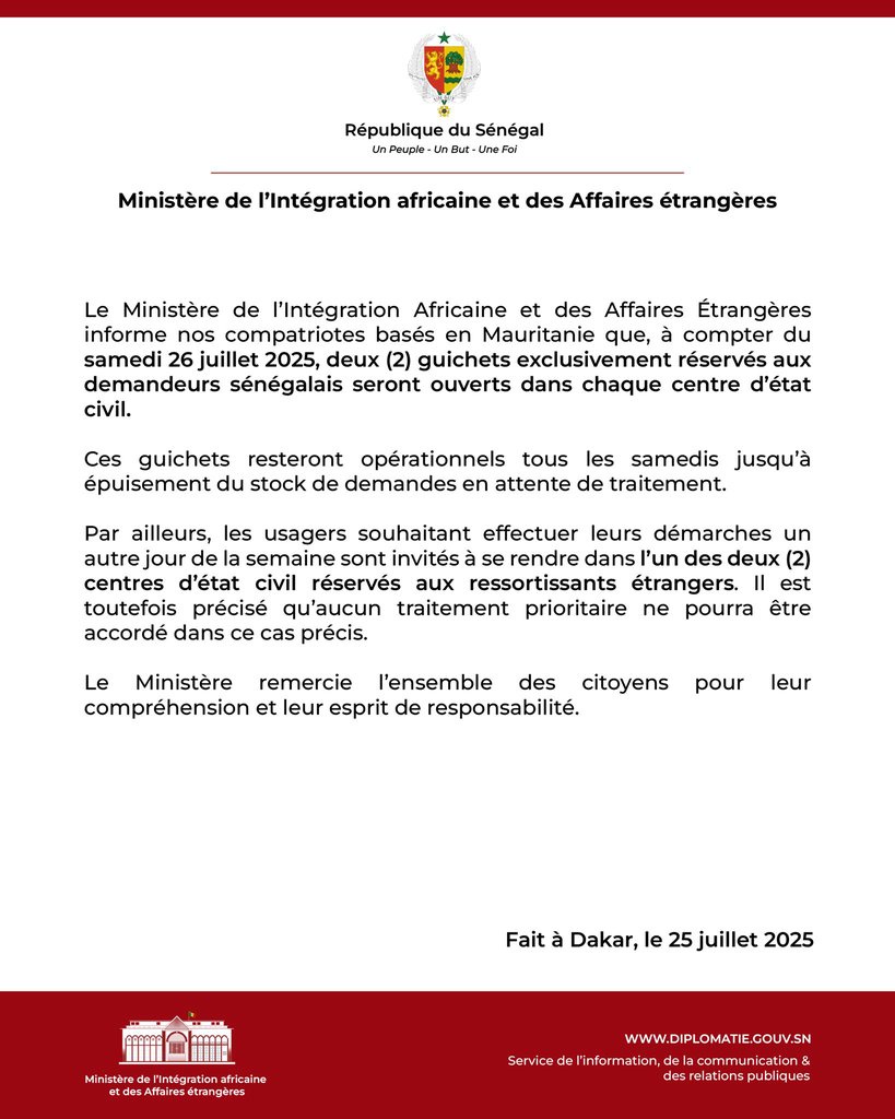 أعلنت وزارة الخارجية السنغالية اليوم الجمعة، عن فتح شباكين (2) مخصصين للسنغاليين المقيمين في موريتانيا على مستوى مختلف مراكز الحالة المدنية كل يوم سبت ابتداء من يوم غد، وذلك “إلى غاية انتهاء الطلبات المتراكمة التي تنتظر المعالجة”.