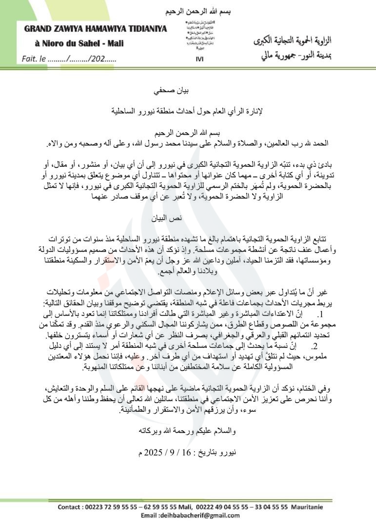 تتابع الزاوية الحموية التجانية باهتمام بالغ ما تشهده منطقة نيورو الساحلية منذ سنوات من توترات وأعمال عنف ناتجة عن أنشطة مجموعات مسلحة. وإذ نؤكد أن هذه الأحداث من صميم مسؤوليات الدولة ومؤسساتها، فقد التزمنا الحياد، املين وداعين اللّٰه عز وجل ان يعمّ الامن والاستقرار والسكينة منطقتذ وبلادنا والعالم أجمع.