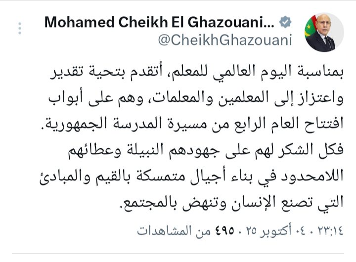 بمناسبة اليوم العالمي للمعلم، وجّه رئيس الجمهورية محمد ولد الشيخ الغزواني تحية تقدير واعتزاز إلى جميع المعلمين والمعلمات، مشيدًا بجهودهم النبيلة في بناء الأجيال.