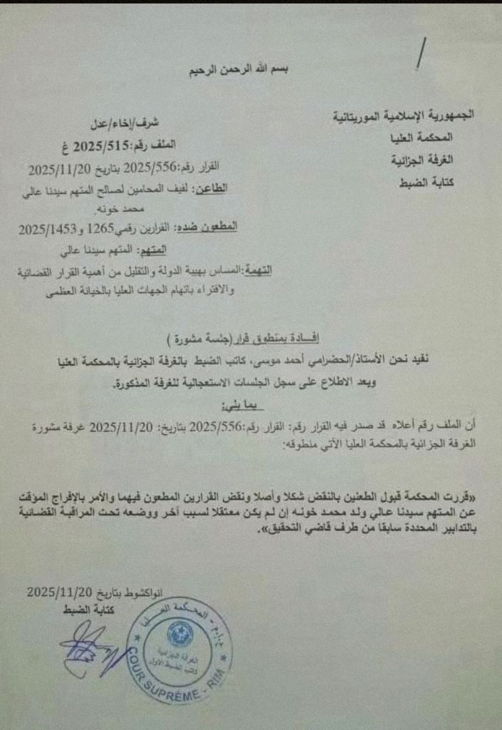منحت الغرفة الجنائية في المحكمة العليا اليوم حرية مؤقتة للسياسي والوزير السابق ورئيس حزب العهد الديمقراطي (تحت التأسيس) سيدنا عالي ولد محمد خونه، بعد سجنه لأكثر من ثلاثة أشهر إثر توقيفه في الحوض الشرقي ونقله إلى العاصمة نواكشوط.
