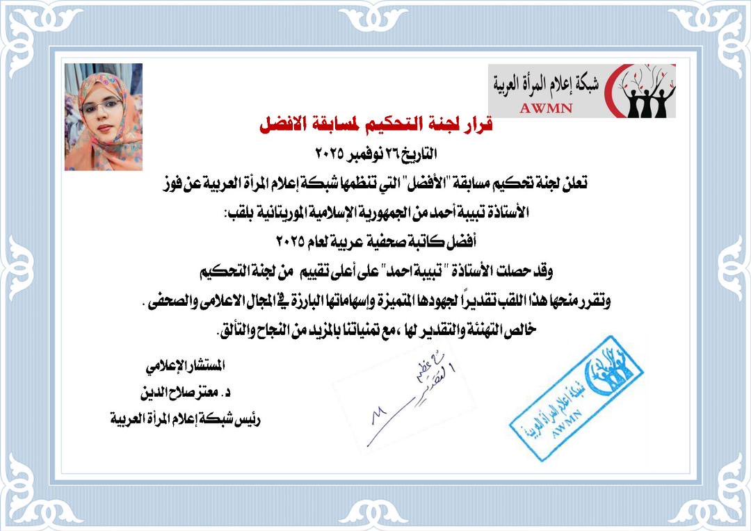 أعلنت لجنة التحكيم التابعة لمسابقة “الأفضل” التي تنظمها شبكة إعلام المرأة العربية، اليوم الأربعاء 26 نوفمبر 2025، فوز الأستاذة تبيبة أحمد من الجمهورية الإسلامية الموريتانية بلقب أفضل كاتبة صحفية عربية لعام 2025.