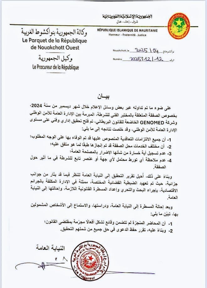 أصدرت وكالة الجمهورية في نواكشوط الغربية، بيانا مفصلا حول نتائج التحقيق في مسألة المختبر الفني للشرطة الوطنية؛ وهي المسألة التي شتغلت الرأي العام الموريتاني و امتداداته في الآونة الأخيرة، و شكلت مصدر قلق لدى عيد الأوساط.